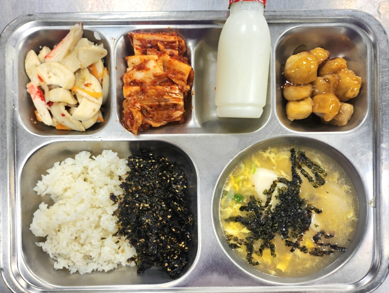 [조식] 미니밥*파래자반(자율), 쇠고기떡국, 새송이맛살볶음, 목화솜탕수육, 배추김치, 파스퇴르요구르트