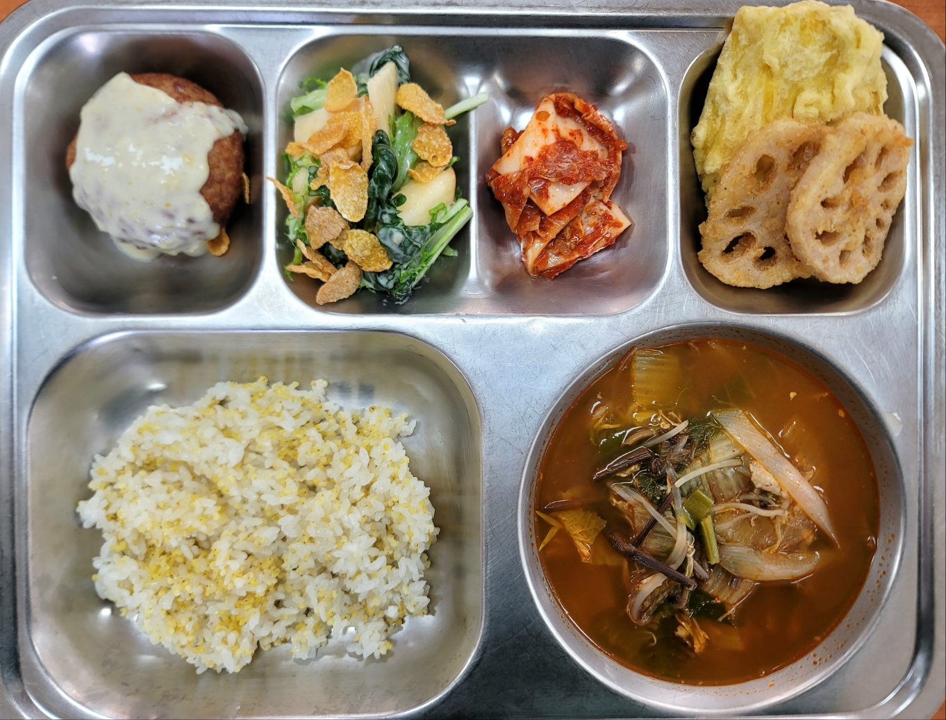 [석식] 기장밥, 닭개장, 시리얼치커리샐러드, 고구마&연근새우튀김, 옥수수함박스테이크, 배추김치