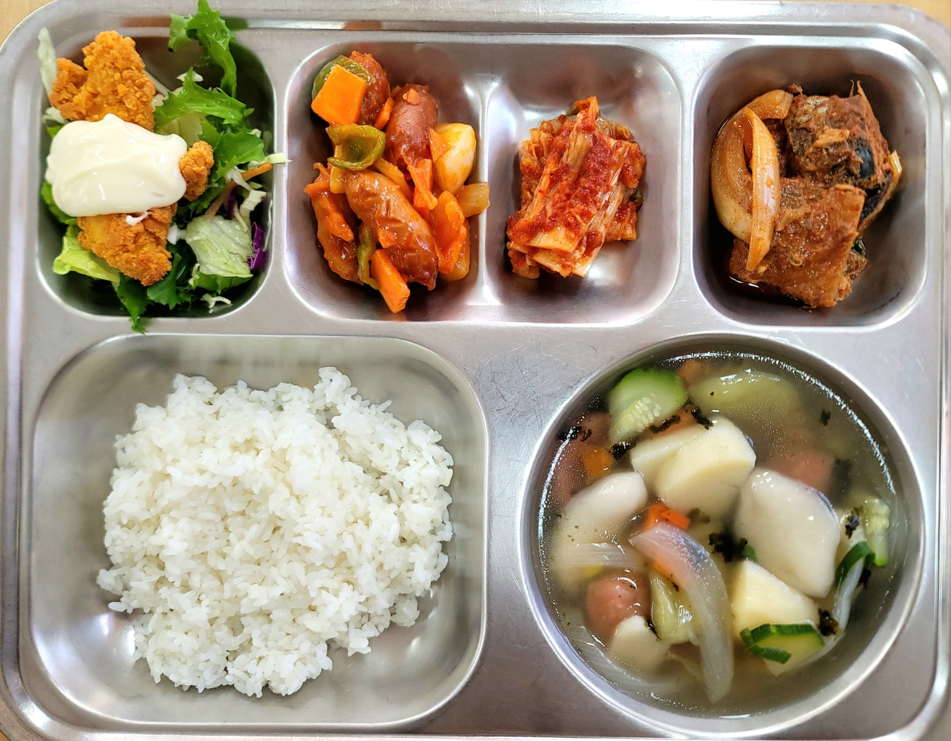 [중식] 친환경찹쌀밥, 삼색감자수제비국, 고등어무조림(자율), 비엔나야채볶음*케찹, 치킨텐더샐러드.,배추김치