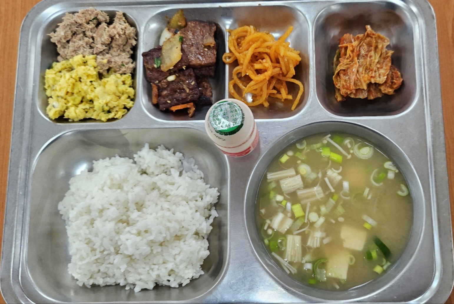 [조식] 참치간장계란밥, 미소된장국, 일미무침, 갈비산적조림, 배추김치, 요구르트