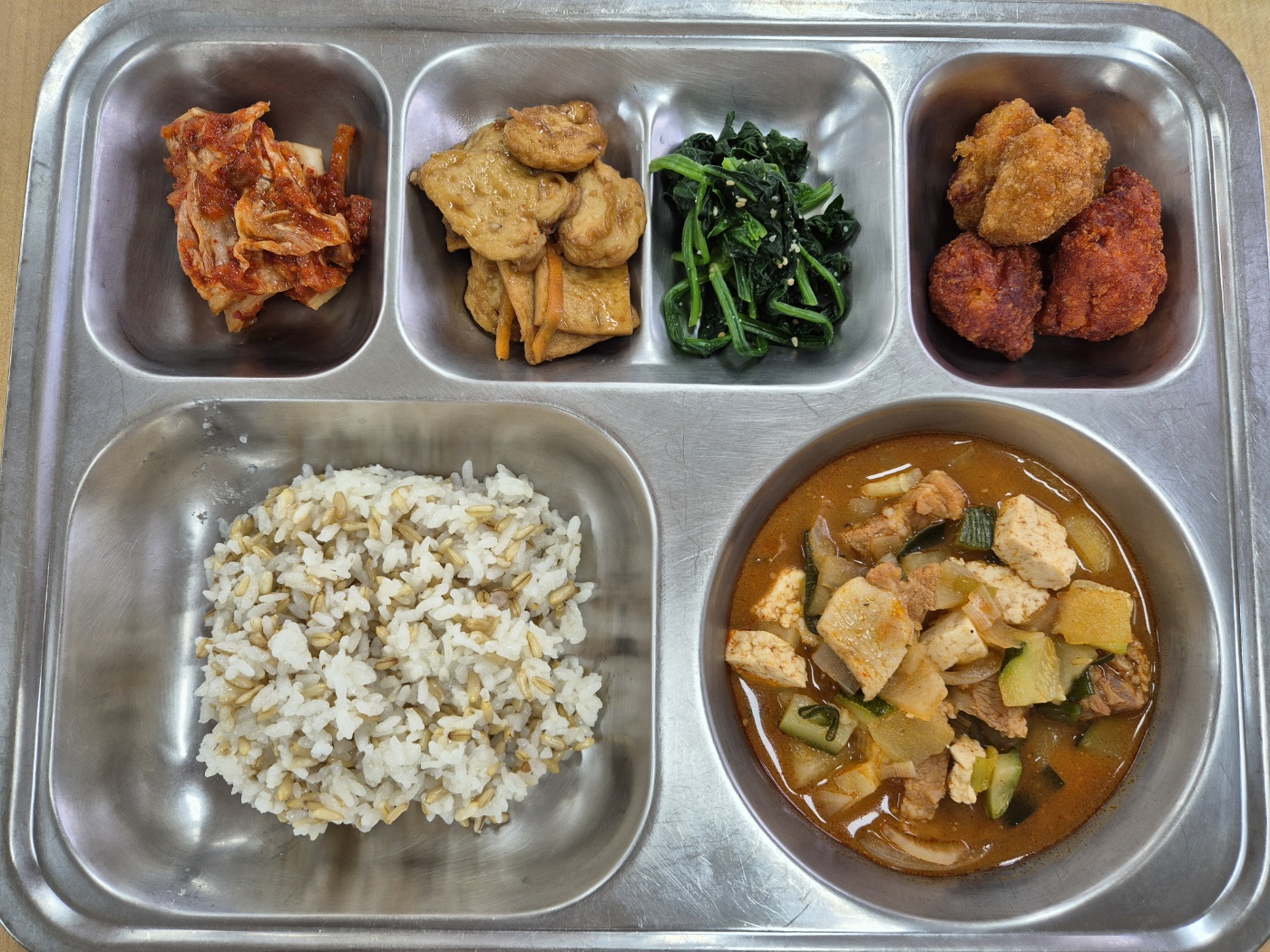 [중식] 건강귀리밥, 돈육고추장찌개, 시금치나물(자율), 모듬어묵볶음, 순살반반치킨, 배추김치