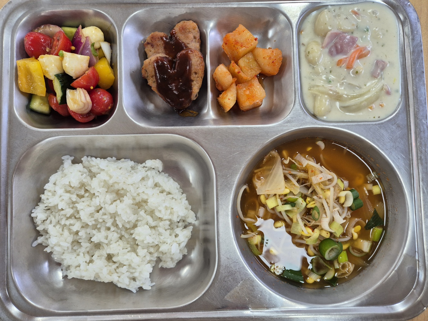 [석식] 친환경찹쌀밥, 크림소스감자뇨끼, 김치콩나물국, 지중해식샐러드, 하트미니함박, 깍두기