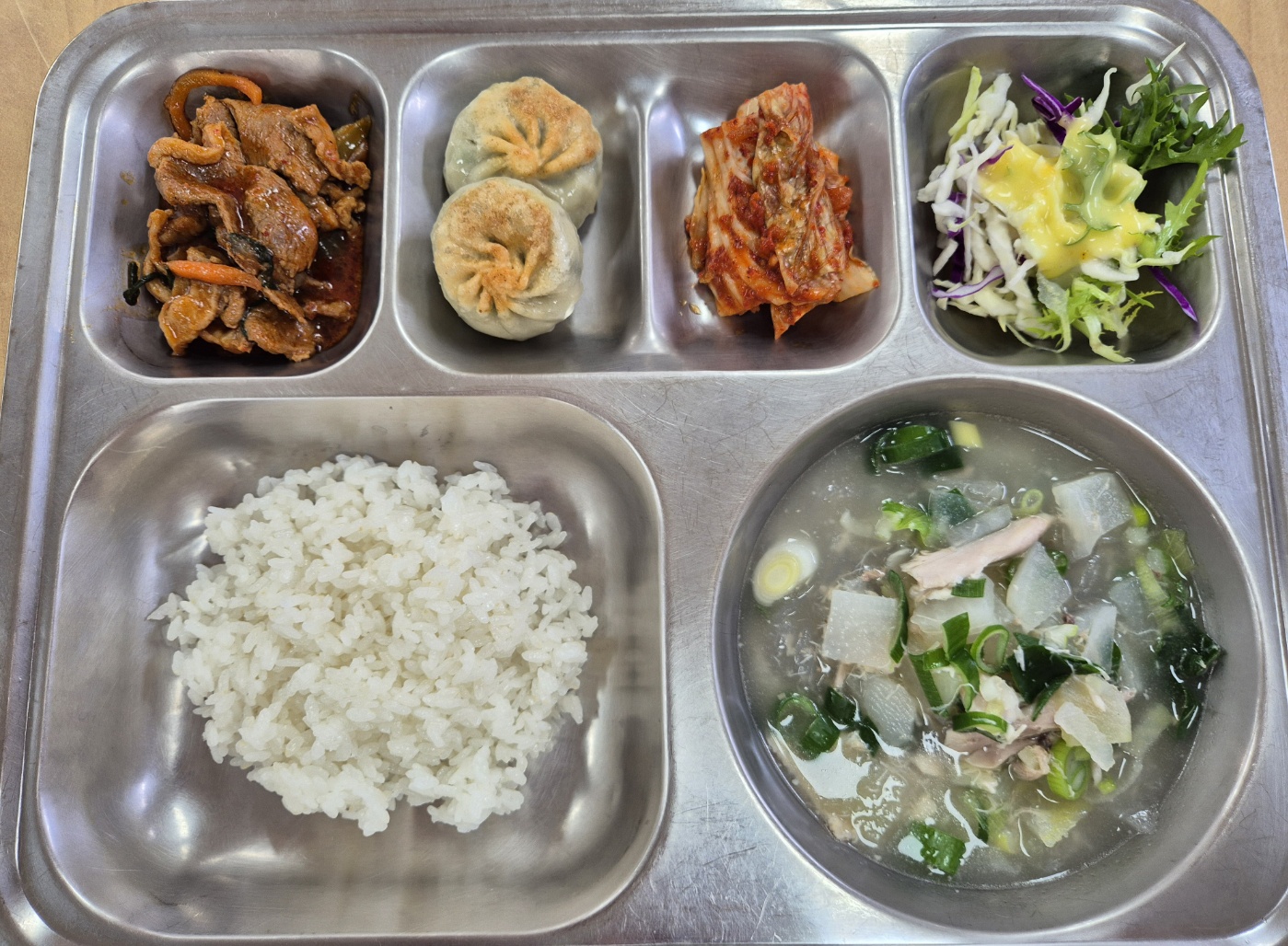 [석식] 친환경찹쌀밥, 닭곰탕*당면사리, 양배추샐러드/유자드레싱, 오리고추장불고기, 호떡만두, 배추김치