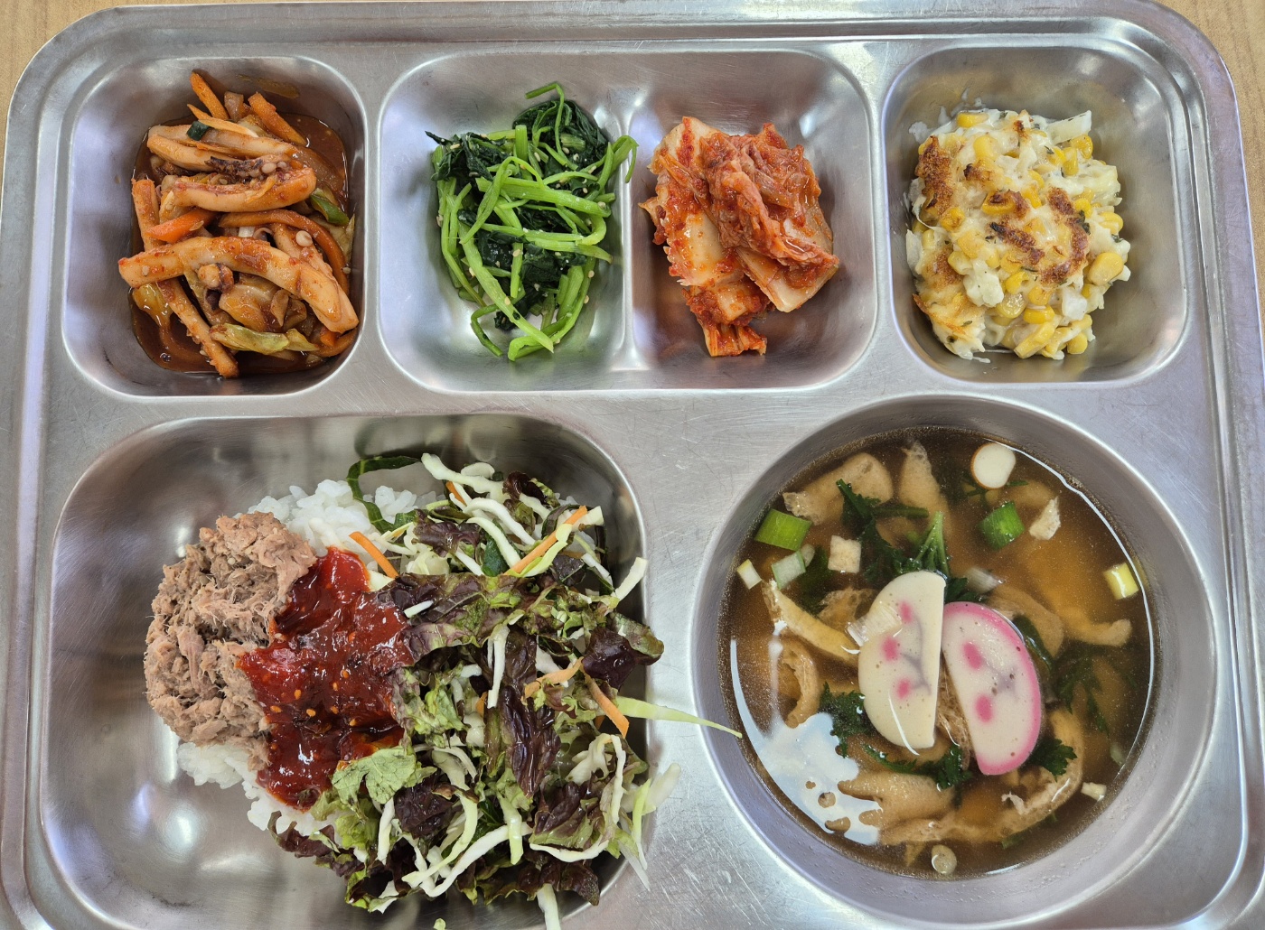 [중식] 참치야채비빔밥, 가쓰오장국, 참나물무침(자율), 오징어야채볶음. 콘치즈오븐구이, 배추김치