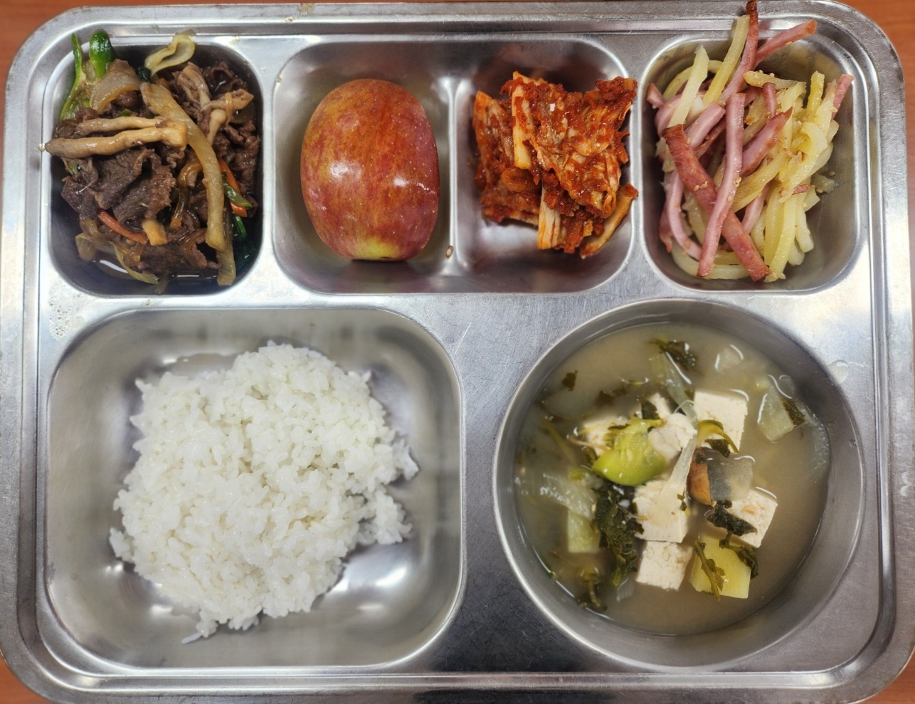 [조식] 친환경찹쌀밥, 냉이된장찌개, 한우버섯당면볶음, 햄감자채볶음, 배추김치, 사과