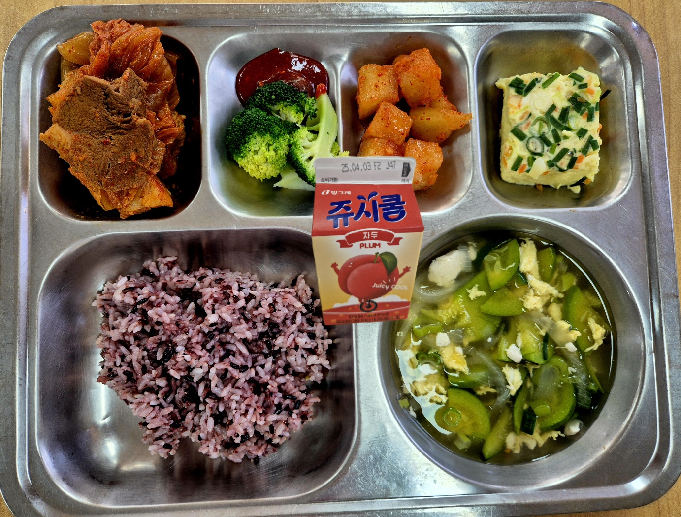 [중식] 찹쌀흑미밥, 애호박새우젓국, 계란찜, 돼지고기김치찜, 브로컬리&초장, 깍두기, 쥬시쿨(자두)