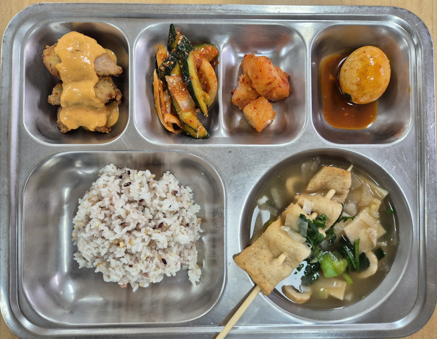 [석식] 친환경잡곡밥, 돼지갈비후라이드, 고추장달걀조림, 오이양파무침(자율), 깍두기