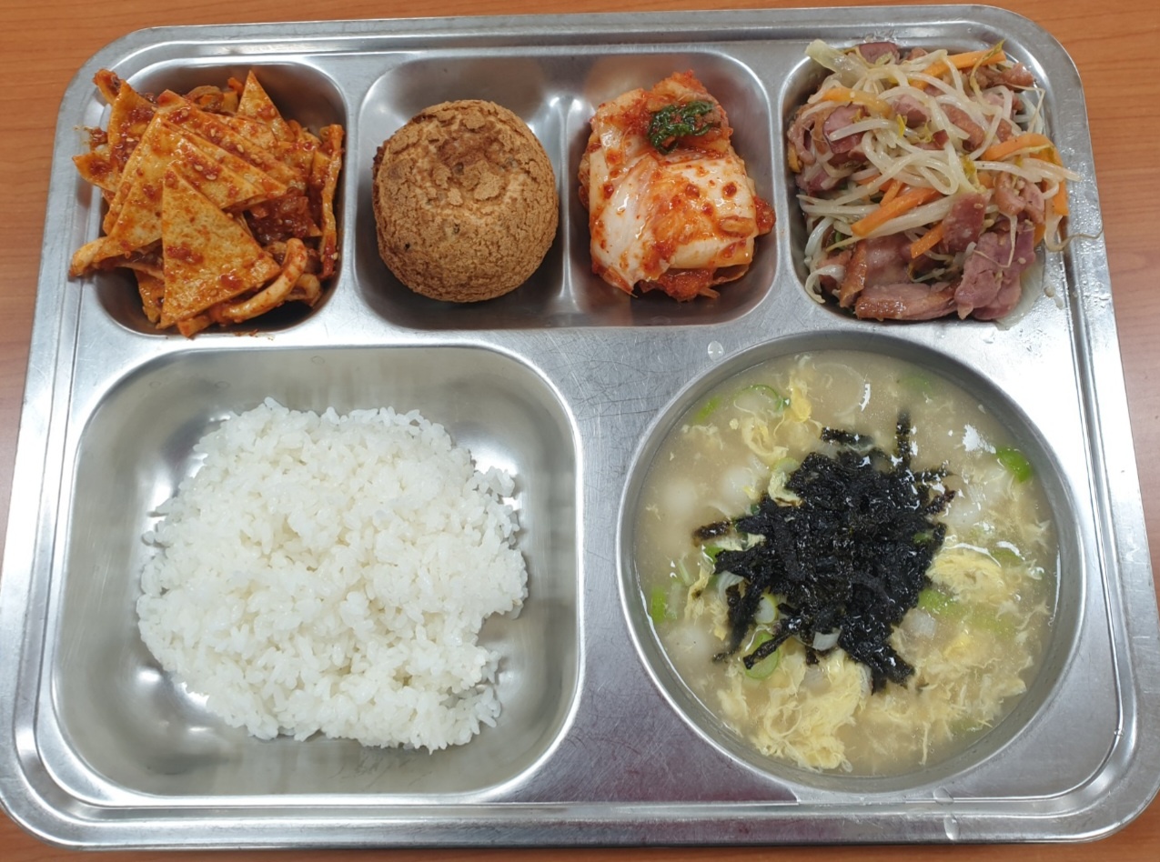 [조식] 친환경찹쌀밥, 조랭이떡국, 훈제오리숙주볶음, 충무식오징어어묵무침, 배추김치, 달콤바삭찰보루빵