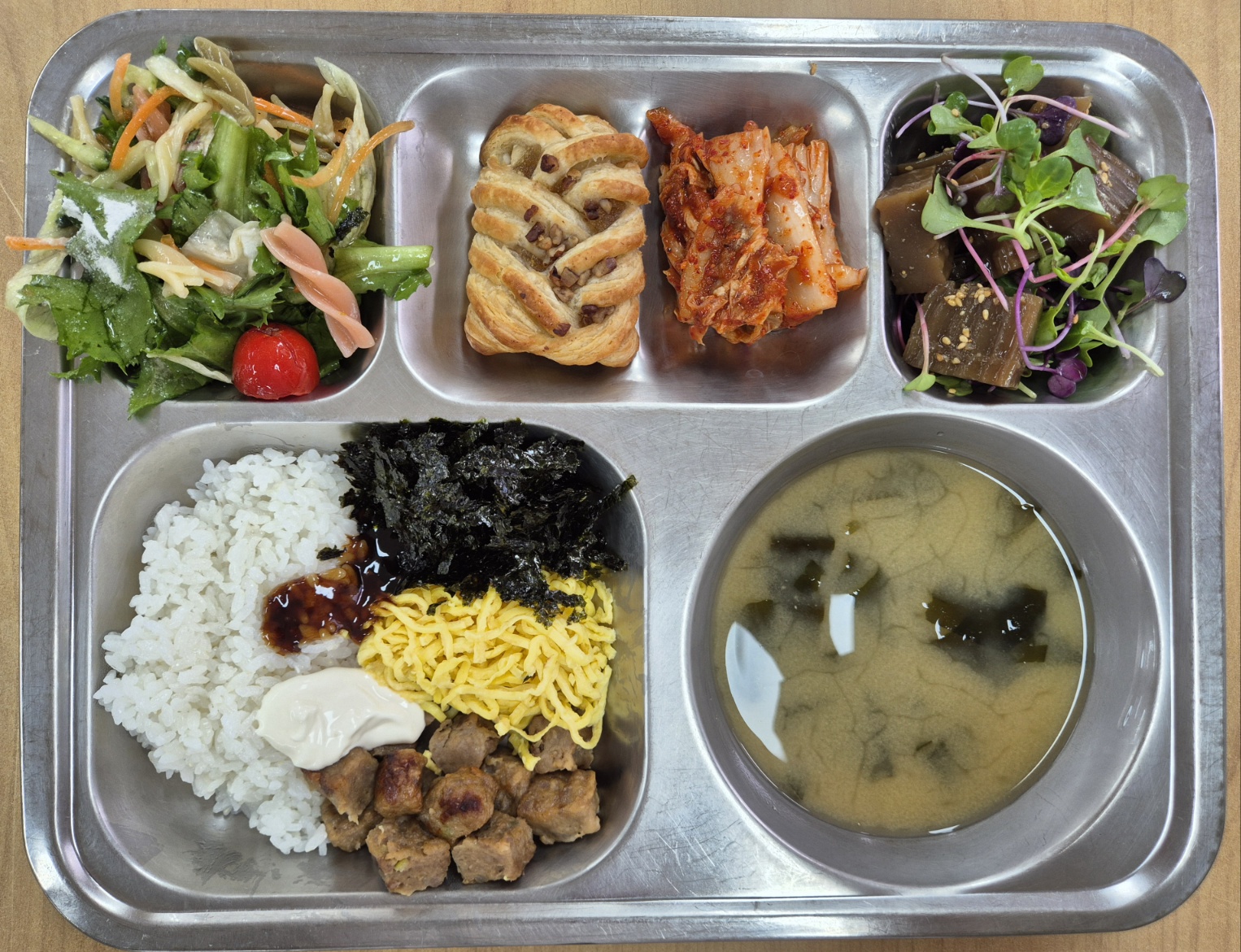[석식] 떡갈비마요덮밥, 미역장국, 어린잎도토리묵무침, 파스타샐러드, 메이플피칸파이, 배추김치