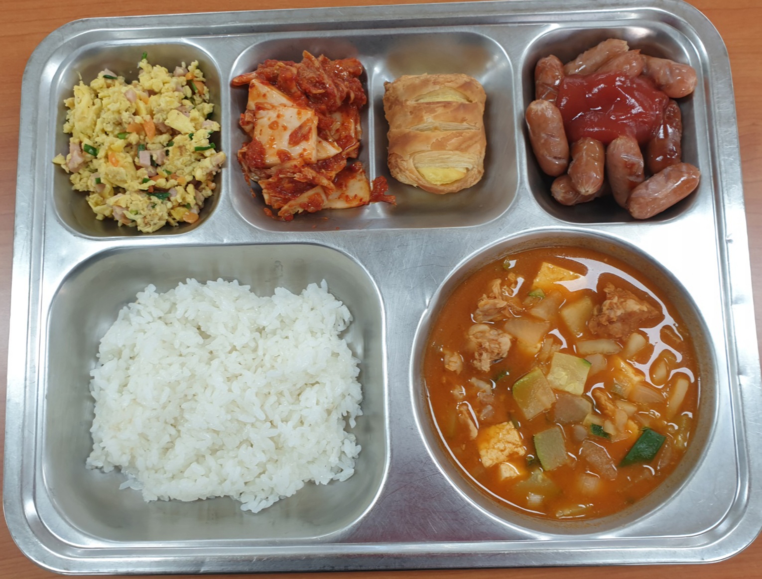 [조식] 친환경찹쌀밥, 돈육고추장찌개, 비엔나구이*케찹, 햄스크램블에그, 배추김치, 미니슈크림파이