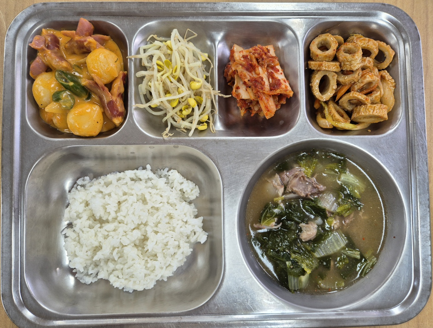 [석식] 친환경찹쌀밥, 사골우거지국, 로제치즈쏙옹볶이, 부들어묵볶음, 콩나물무침, 배추김치, 초록매실