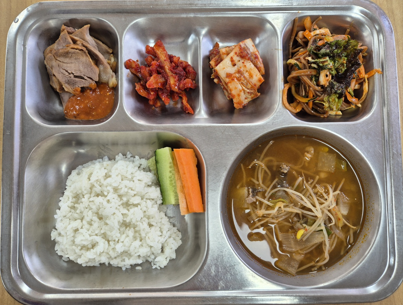 [중식] 친환경찹쌀밥, 경상도식쇠고기무국, 깐깐슈바이족발, 비빔막국수, 무말랭이무침(완제), 배추김치, 채소스틱(자율)