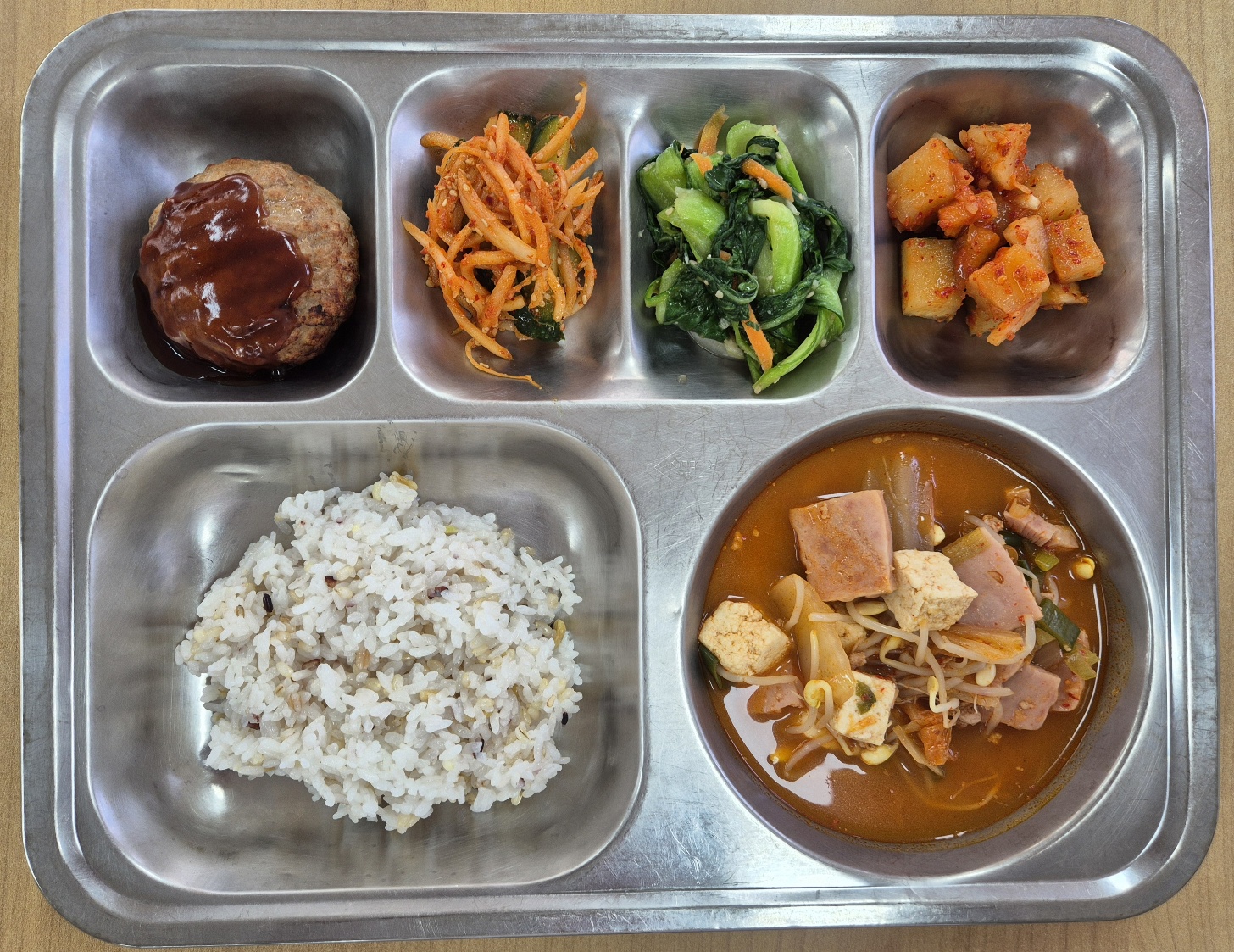 [중식] 친환경잡곡밥, 부대찌개, 옥수수함박스테이크/소스, 도라지오이무침, 청경채볶음, 깍두기