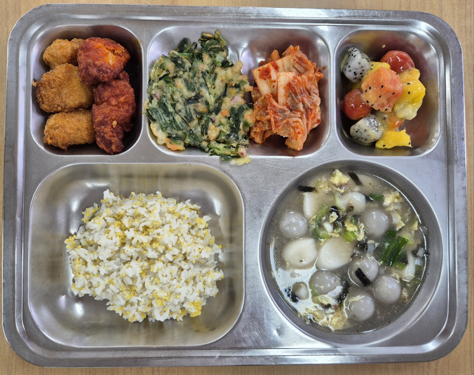 [석식] 기장밥, 새알심만두떡국, 순살반반치킨, 해물부추전, 열대과일샐러드, 배추김치