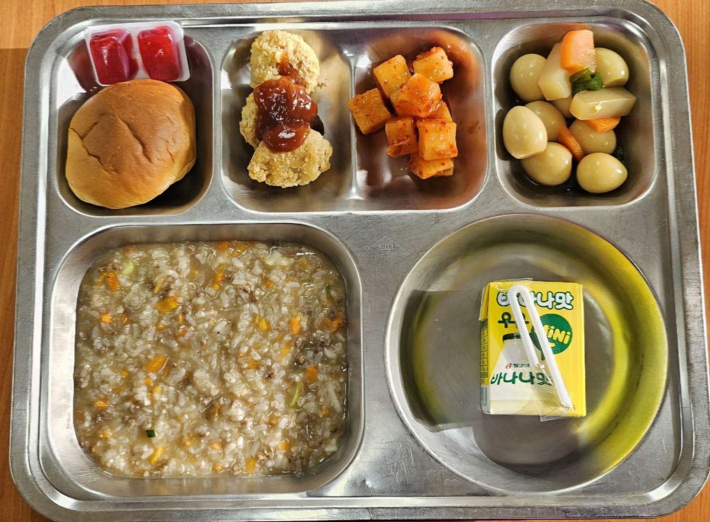 [조식] 쇠고기야채죽, 한입쏙까스, 메추리알곤약조림, 모닝빵/딸기쨈, 바나나우유
