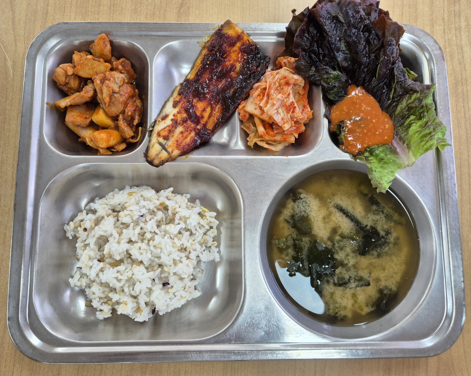 [중식] 친환경잡곡밥, 시금치된장국, 춘천식닭갈비, 고등어양념구이(자율), 상추쌈/쌈장(자율), 배추김치