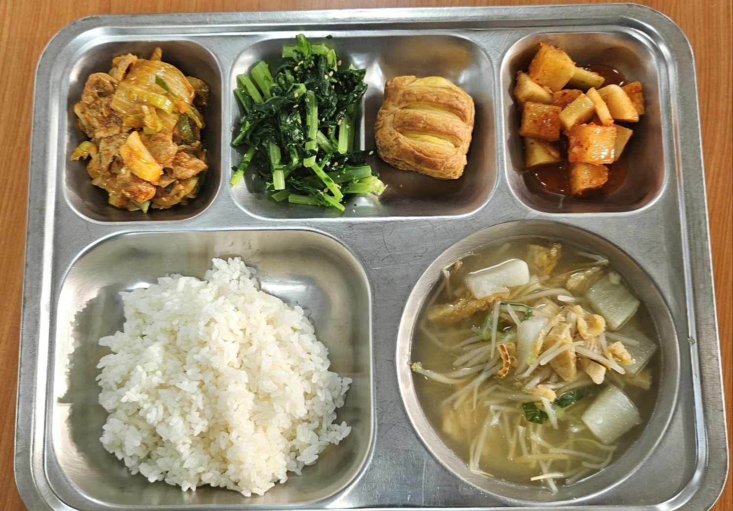 [조식] 친환경찹쌀밥, 북어콩나물국, 돈육김치볶음, 열무나물(자율), 미니슈크림파이, 깍두기,