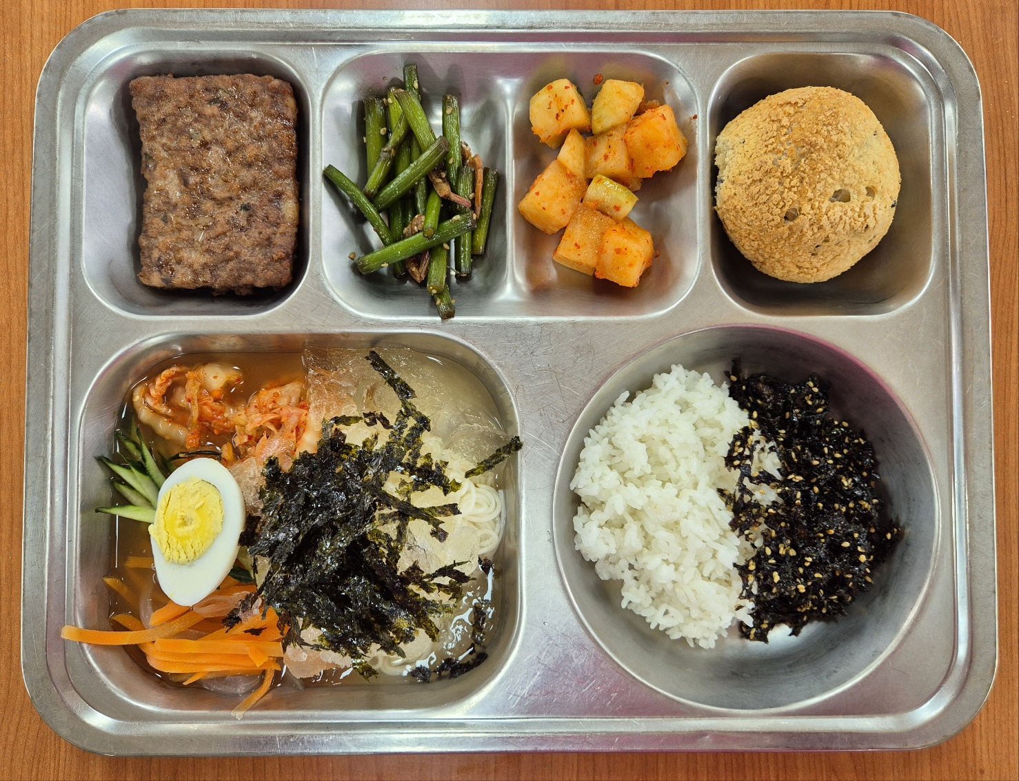 [석식] 미니밥*파래자반(자율), 김치말이냉국수, 남도떡갈비, 마늘쫑건새우볶음, 달콤바삭찰보루빵, 깍두기