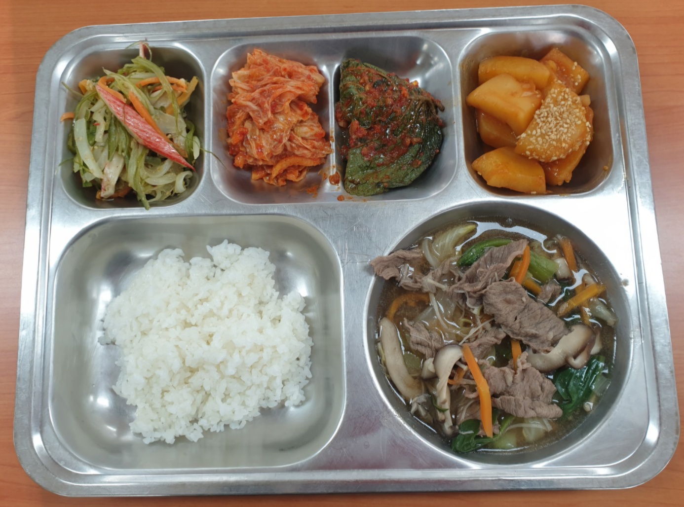 [조식] 친환경쌀밥, 한우버섯전골*당면사리, 고추장감자조림, 맛살미역줄기볶음, 양념깻잎지, 배추김치