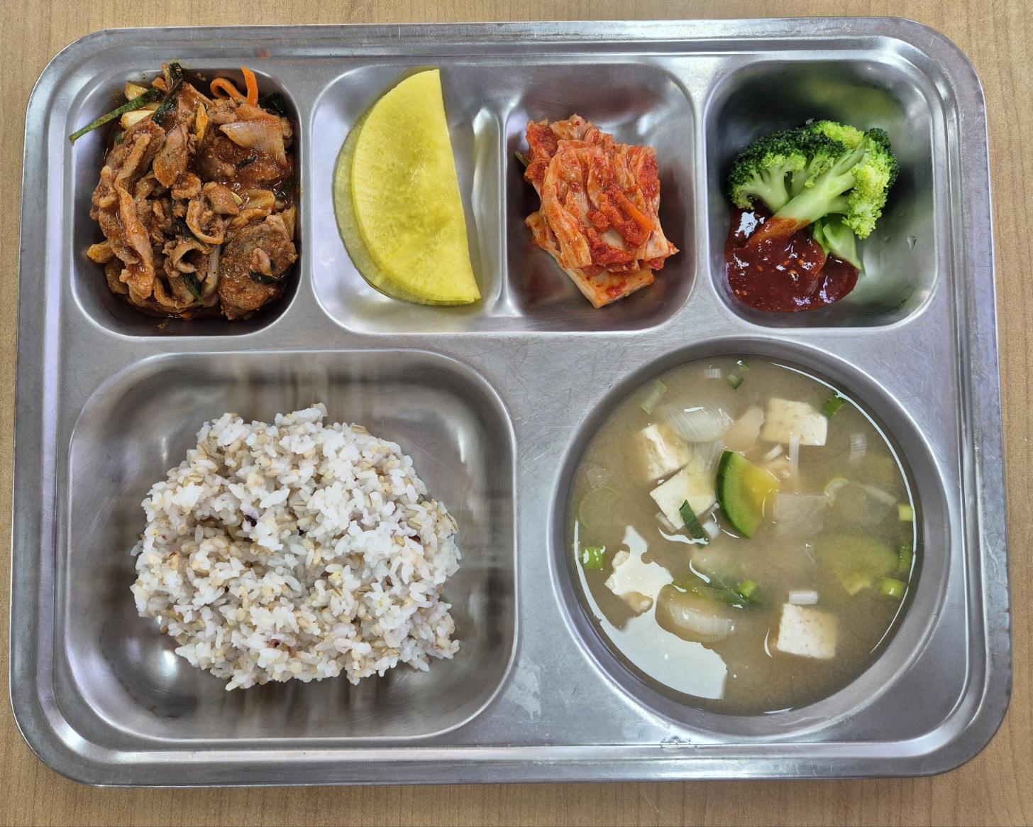[중식] 친환경잡곡밥, 버섯된장찌개, 오리고추장불고기, 브로콜리&초장, 쌈무(완제), 배추김치