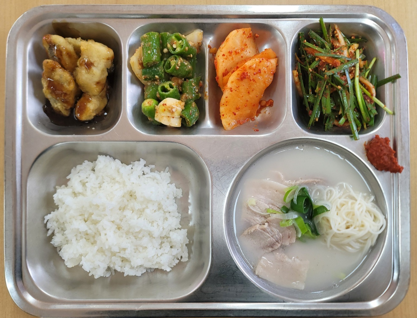 [석식] 친환경찹쌀밥, 돼지국밥*소면, 순살코다리강정, 부추겉절이, 아삭고추양파된장무침(자율), 석박지