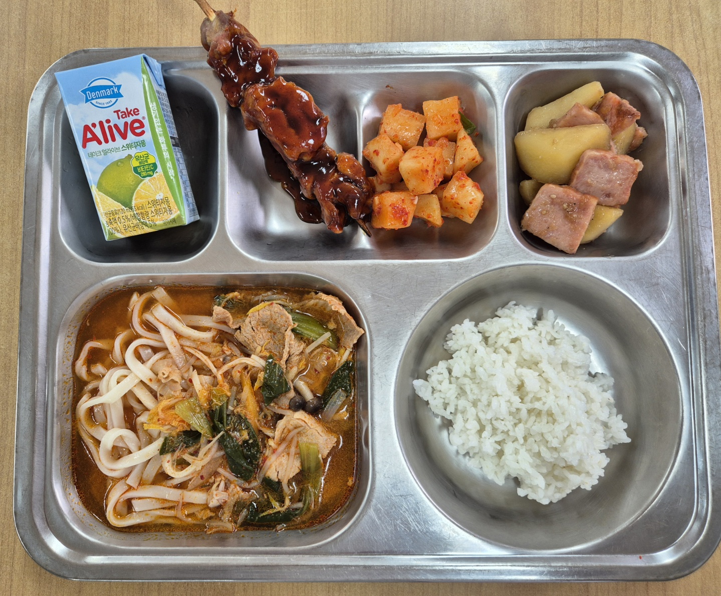 [석식] 미니밥(자율), 얼큰샤브샤브칼국수, 매콤닭꼬치, 햄감자조림, 깍두기, 스위티자몽주스