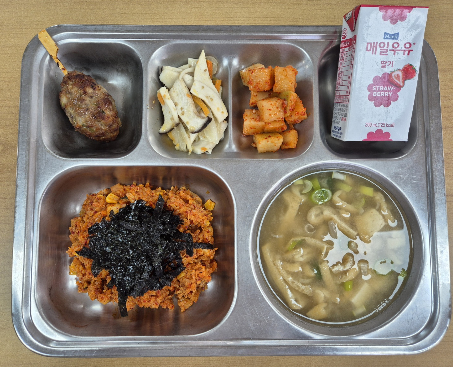 [중식] 닭살야채볶음밥, 유부장국, 한우한돈츠쿠네, 새송이버섯볶음(자율), 깍두기, 딸기우유
