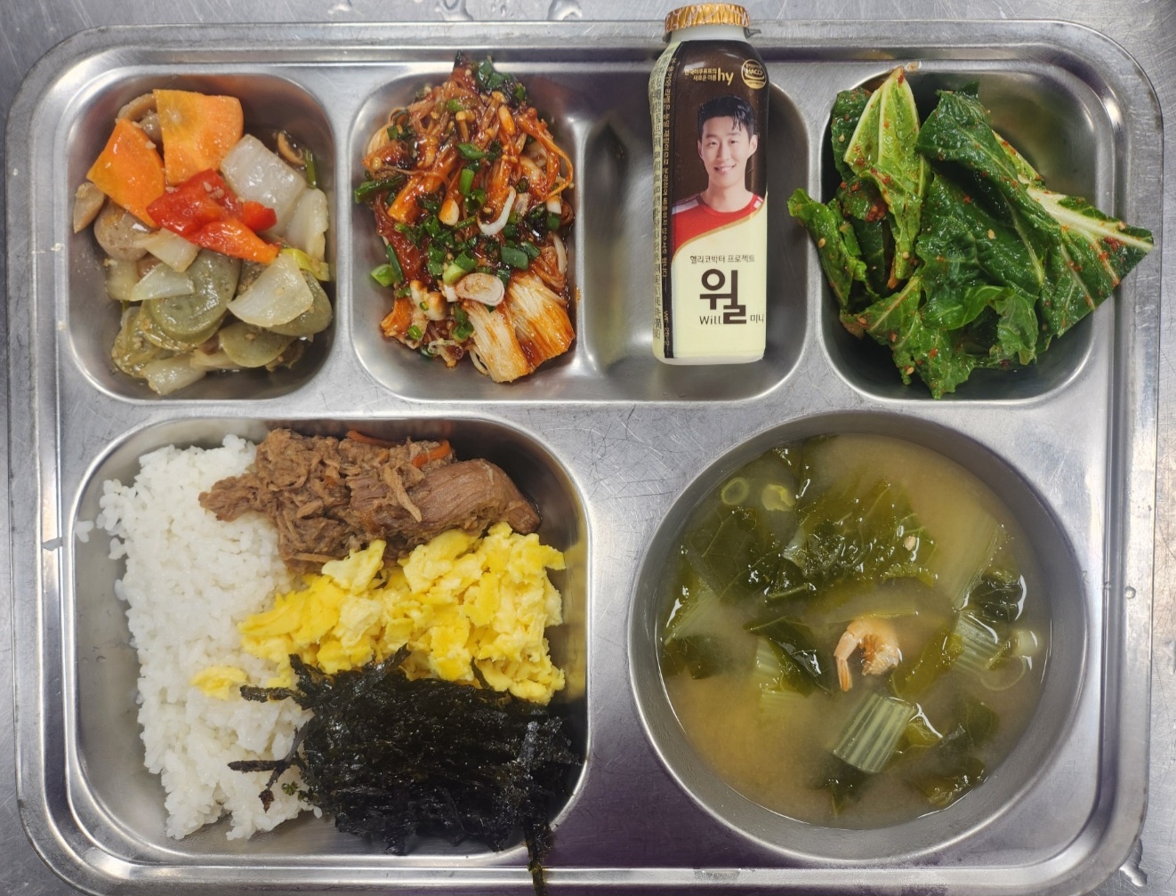 [조식] 버터장조림계란덮밥, 건새우배추국, 모듬소시지볶음, 매콤팽이버섯볶음, 쌈추겉절이, 윌요구르트