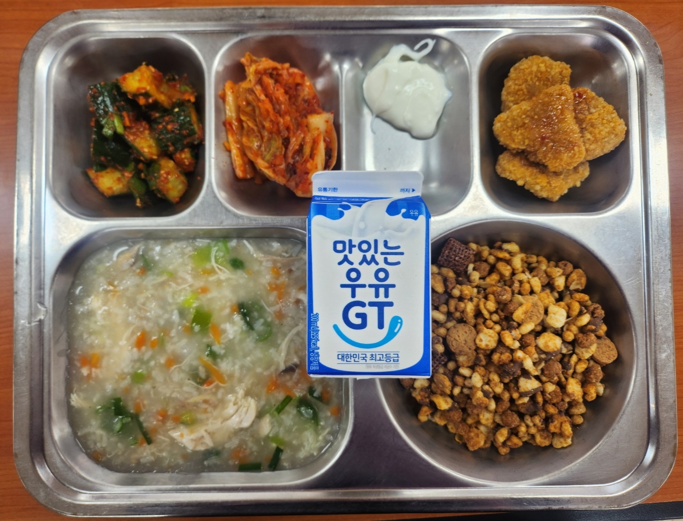 [조식] 영양닭야채죽, 크리스피돈강정, 오이소박이(자율),배추김치, 그래놀라씨리얼다이제, 우유*요거트