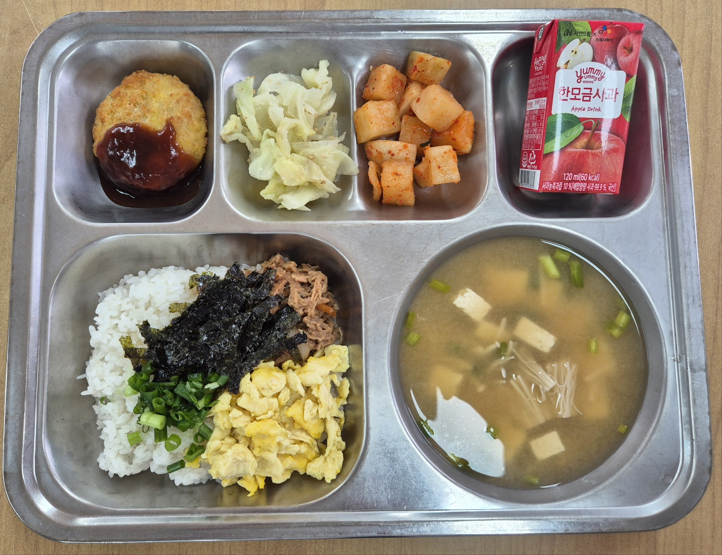 [석식] 버터장조림계란덮밥, 미소된장국, 멘츠카츠/소스, 양배추나물무침, 사과한모금, 깍두기