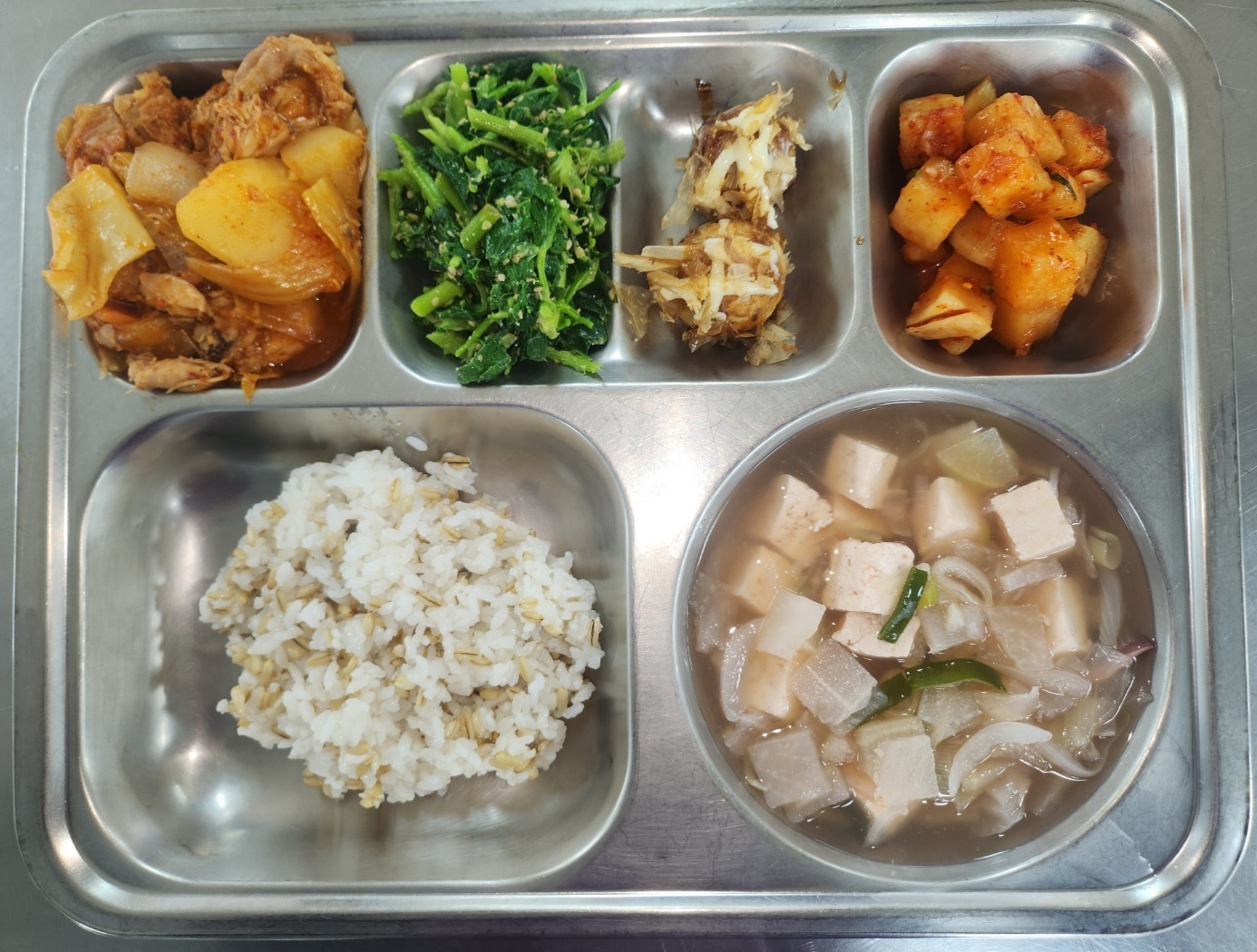 [석식] 건강귀리밥, 오징어무국, 묵은지닭볶음탕, 방풍나물무침, 타코야끼, 깍두기