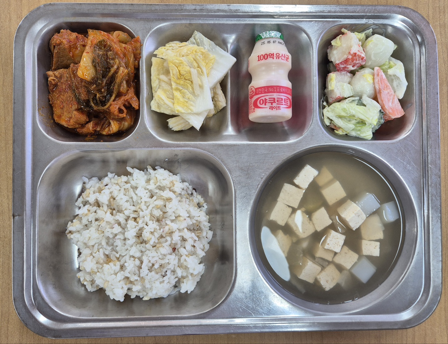 [중식] 친환경잡곡밥, 맑은두부탕국, 돼지고기김치찜, 꽃말살샐러드, 백김치, 요구르트