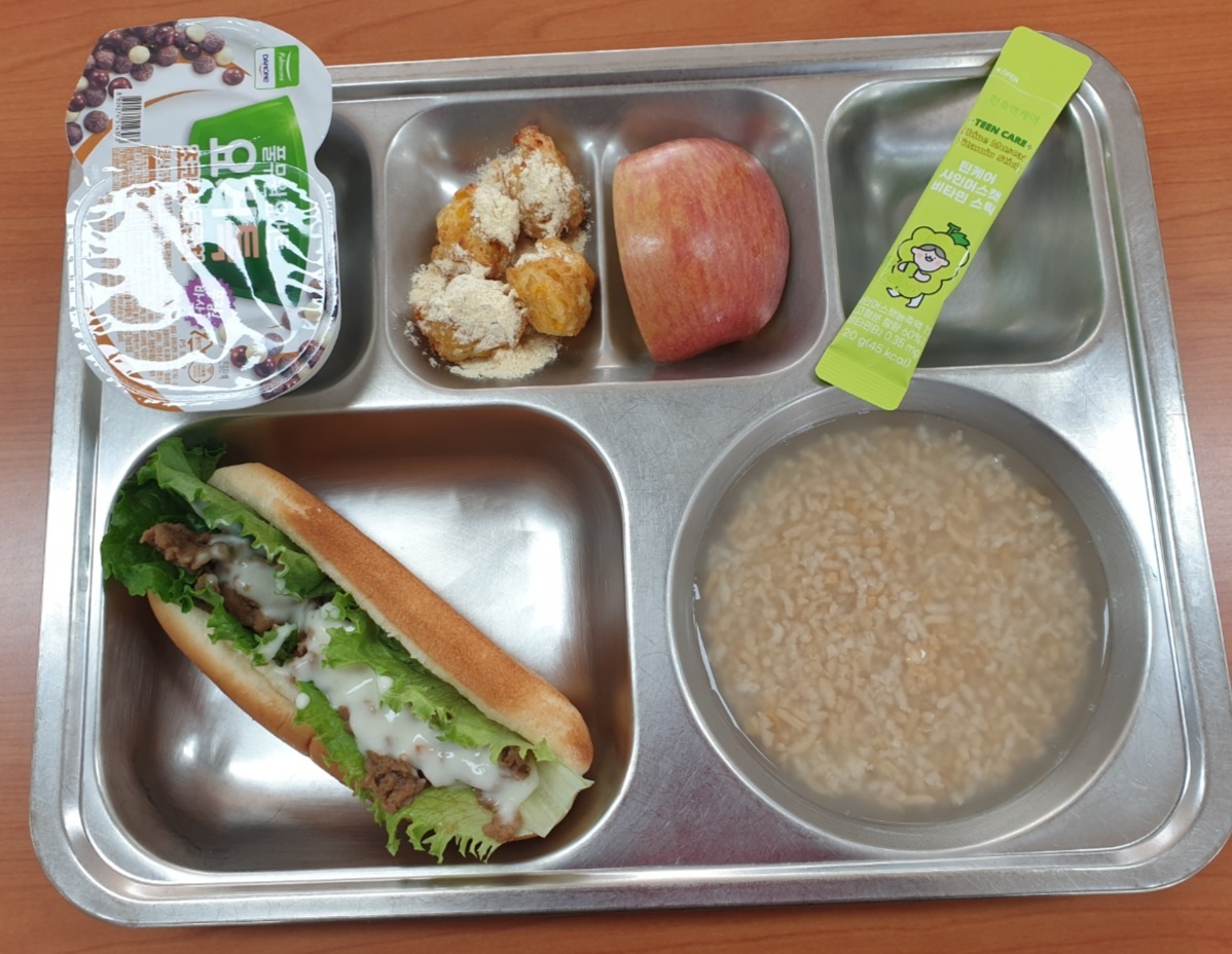 [조식] 숭늉, 리얼콘볼, 돼지불고기핫도그, 사과, 요거톡&초코볼, 샤인머스캣비타민스틱