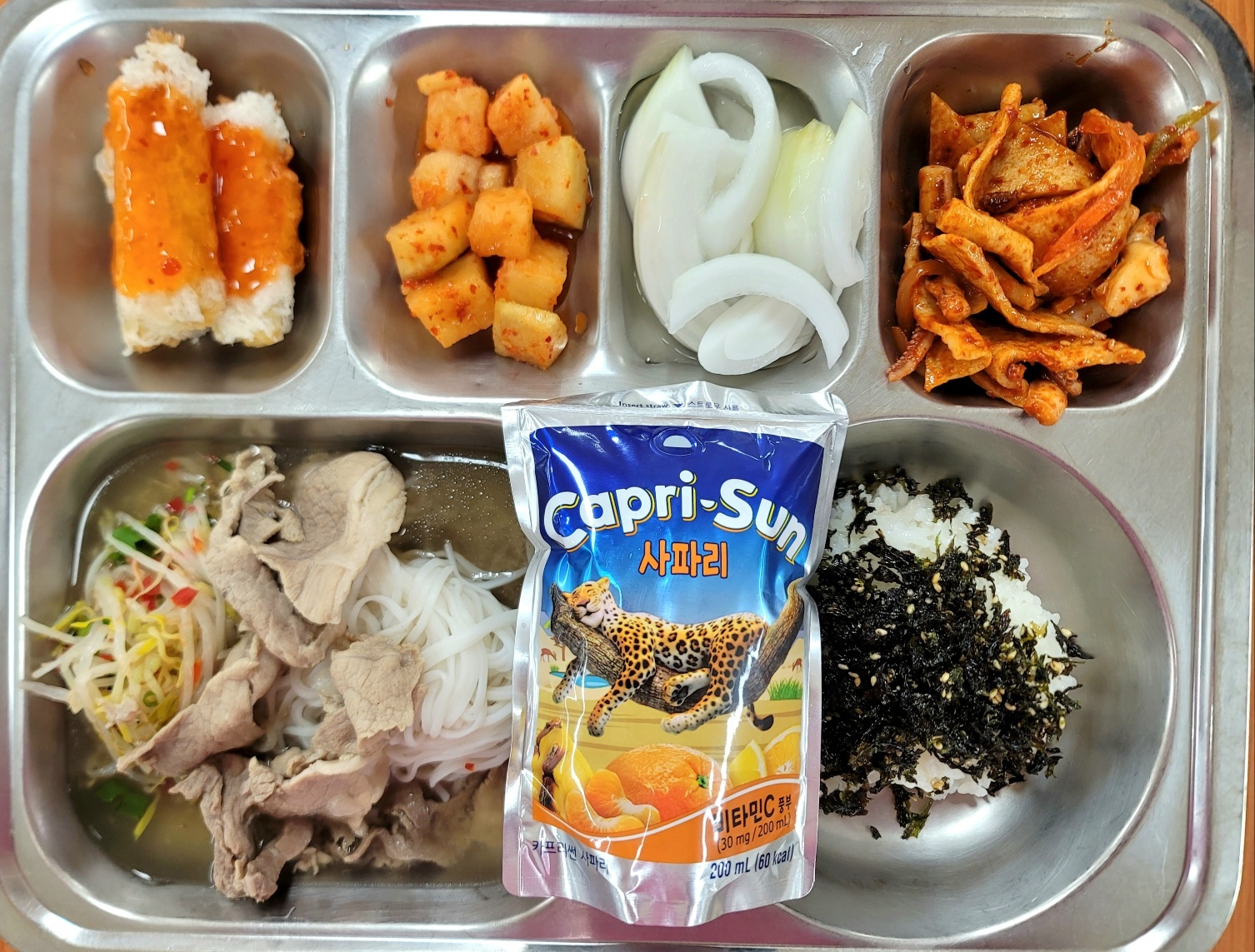 [석식] 미니밥*파래자반(자율), 용남쌀국수, 통새우짜조롤, 충무식오징어어묵무침, 양파초절임(자율), 카푸리썬, 깍두기