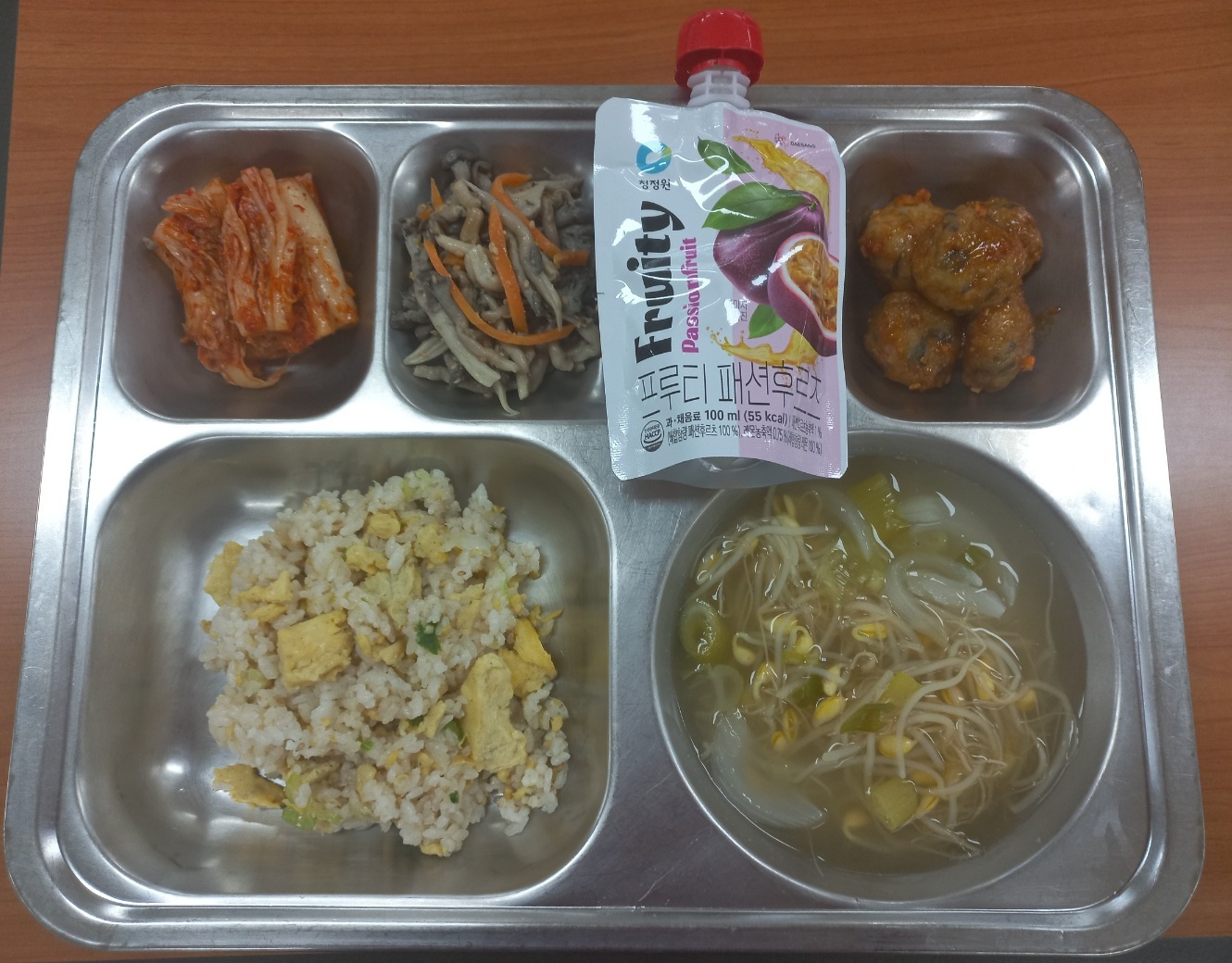 [조식] 계란볶음밥, 맑은콩나물국, 굴림만두강정, 애느타리버섯볶음(자율), 배추김치, 패션후르츠주스