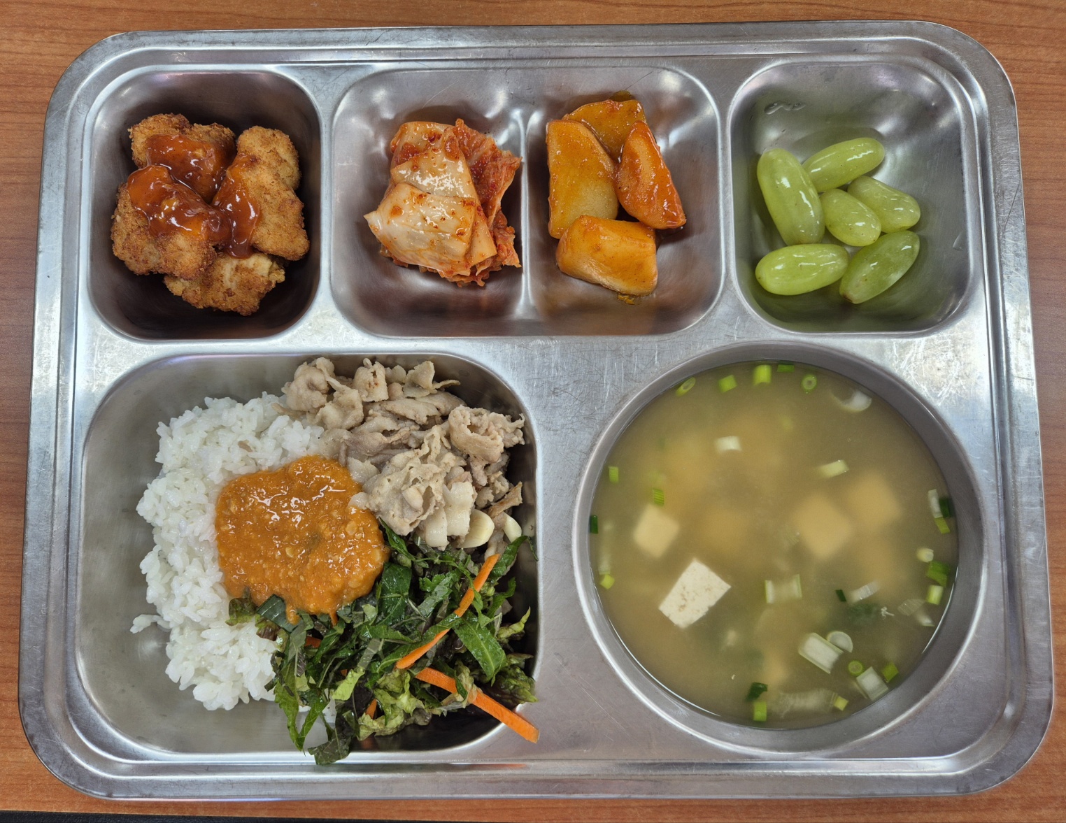 [중식] 대패삼겹비빔밥, 미소된장국, 닭가슴살후라이드강정, 고추장감자조림, 청포도, 배추김치