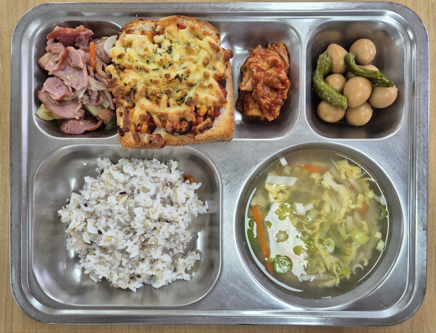 [석식] 친환경잡곡밥, 감자채국, 연잎돼지순살야채볶음, 메추리알꽈리초조림, 수제피자식빵, 배추김치