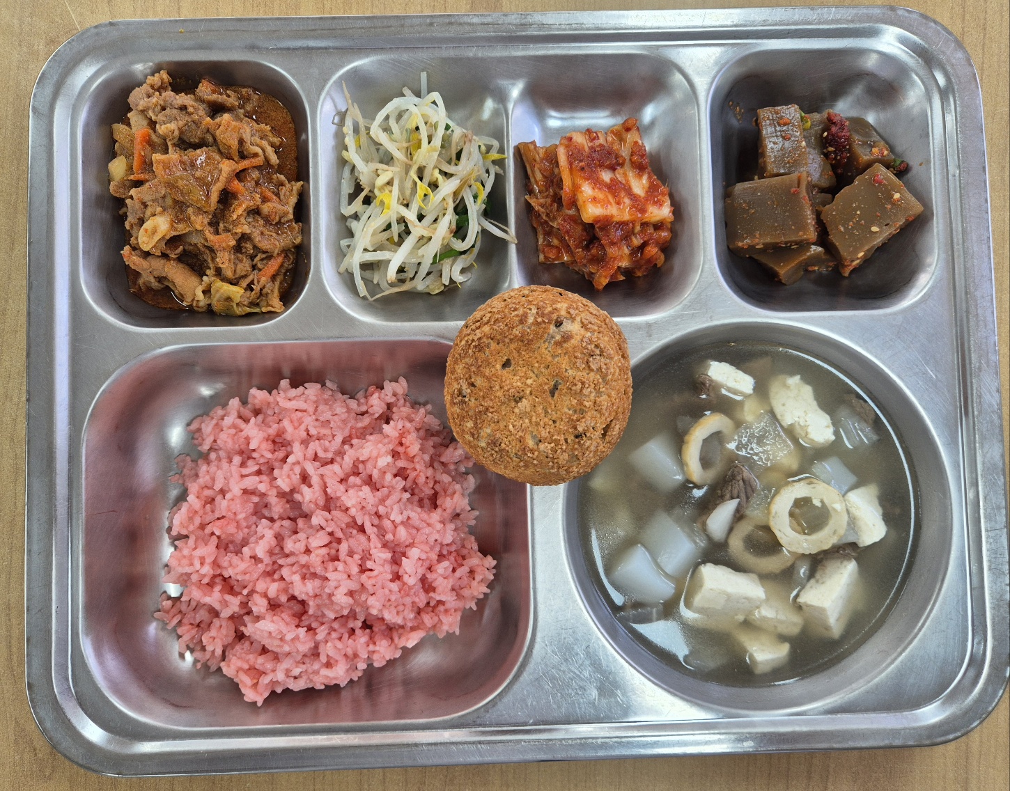 [중식] 홍국쌀밥, 쇠고기탕국, 고추장불고기, 도토리묵&양념장, 부추숙주나물무침, 배추김치, 달콤바삭찰보루빵
