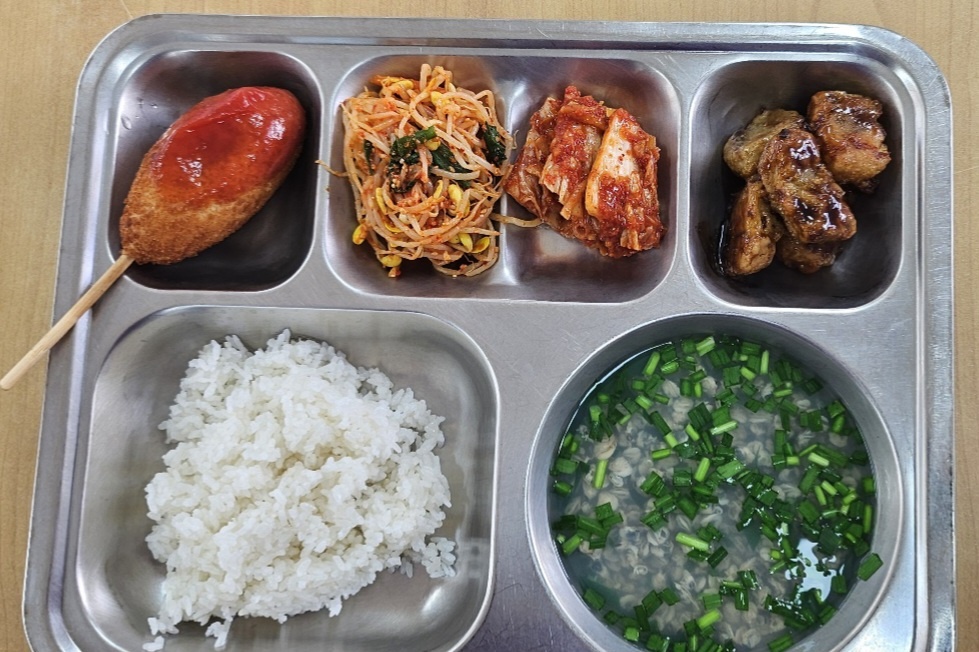 [조식] 친환경찹쌀밥, 하동재첩국, 순살코다리강정, 매콤콩나물무침, 탱글뽀득핫도그, 배추김치