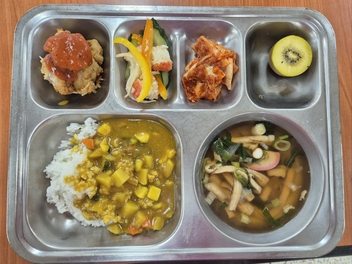 [중식] 카레라이스, 가쓰오장국, 한입안심통카츠, 오이꽃맛살냉채, 키위, 배추김치
