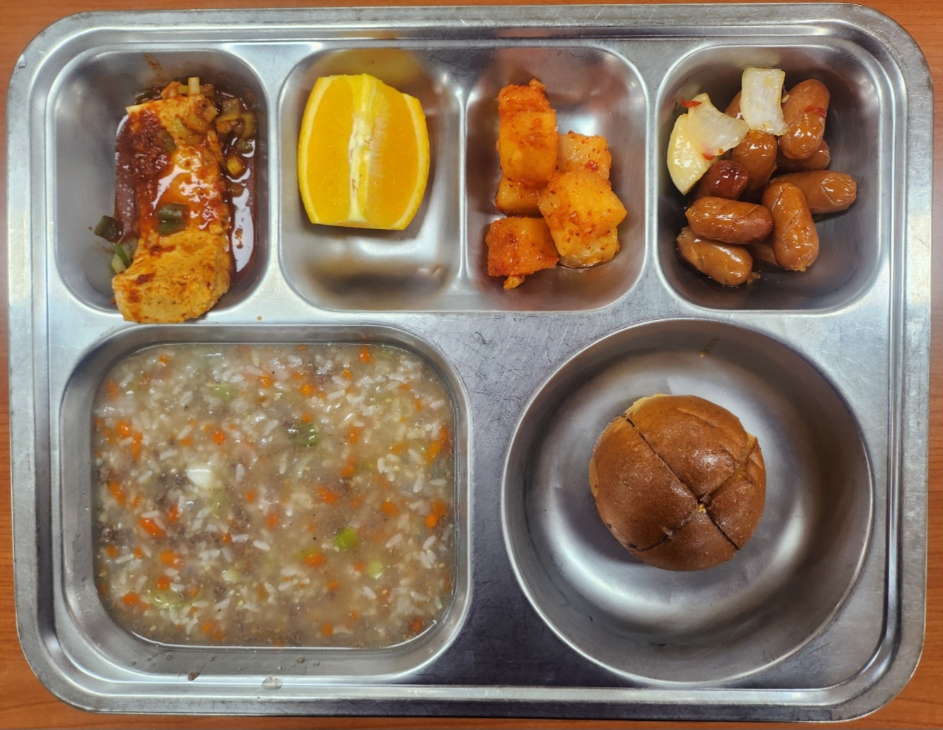 [조식] 쇠고기야채죽, 비엔나야채칠리조림, 두부조림, 크림품은4쪽마늘빵, 오렌지, 깍두기