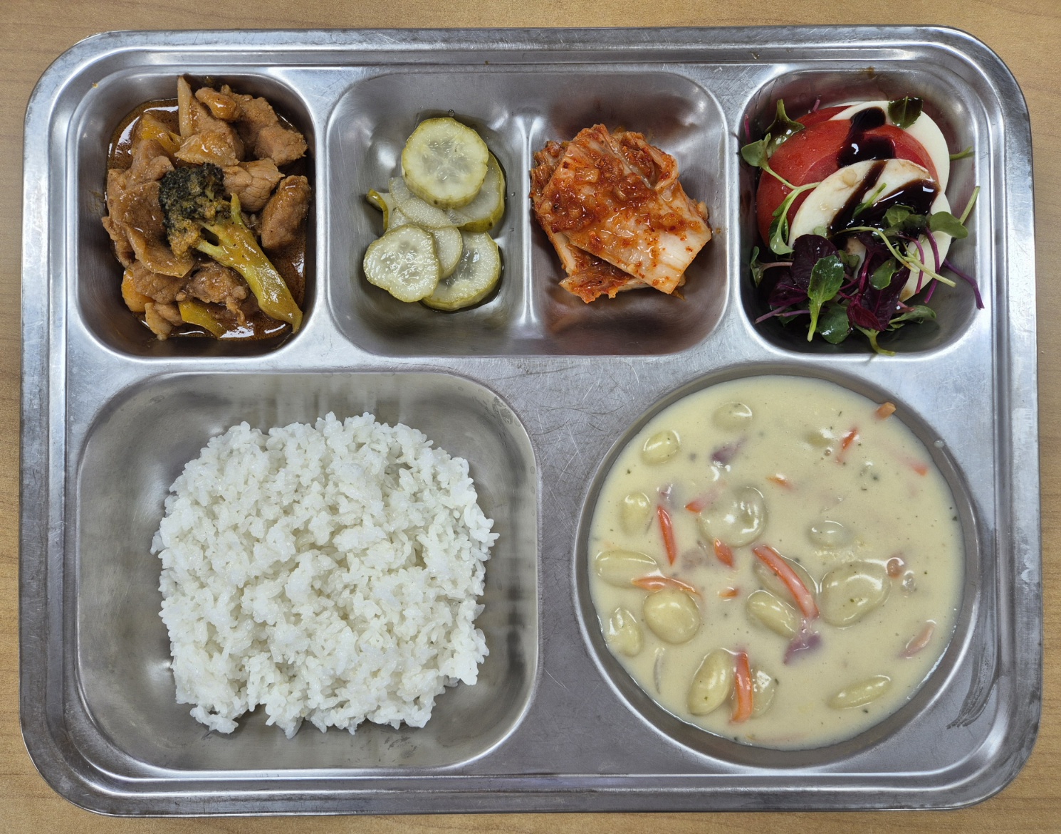 [석식] 친환경찹쌀밥, 돈큐브스테이크, 크림소스감자뇨끼, 카프레제샐러드, 오이피클, 배추김치
