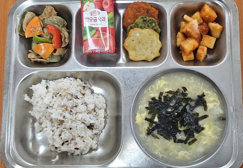 [조식] 친환경잡곡밥, 조랭이떡국, 모듬소시지볶음, 모듬전, 사과한모금, 깍두기