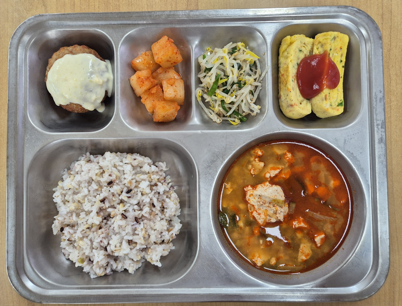 [석식] 친환경잡곡밥, 해물순두부찌개, 불닭함박스테이크, 달걀말이, 부추숙주나물, 깍두기