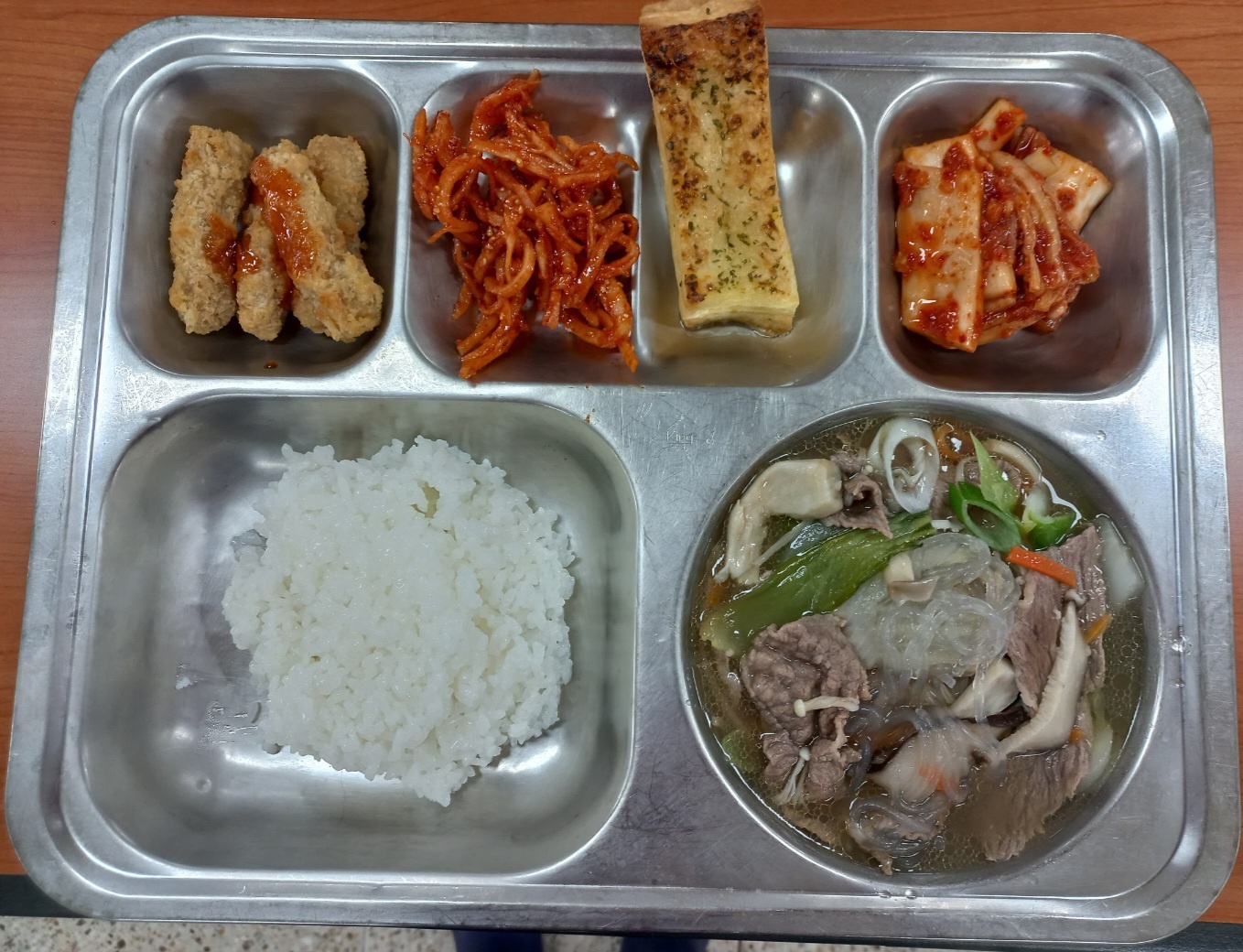 [조식] 친환경찹쌀밥, 한우버섯전골*당면사리, 돈육스틱카츠강정, 일미무침, 바나나크림치즈파이, 배추김치