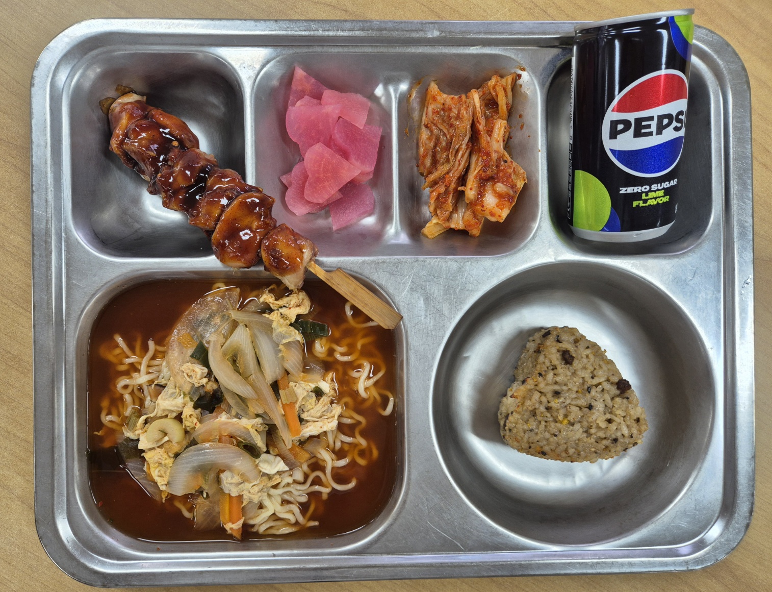 [중식] 쇠고기삼각주먹밥, 용남고라면, 매콤닭꼬치, 하트단무지, 탄산음료, 배추김치