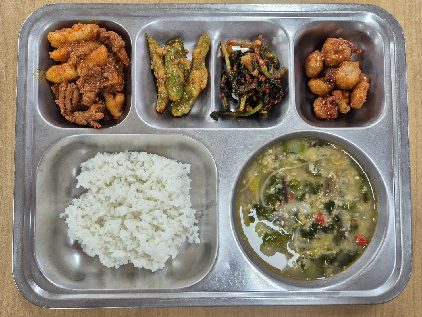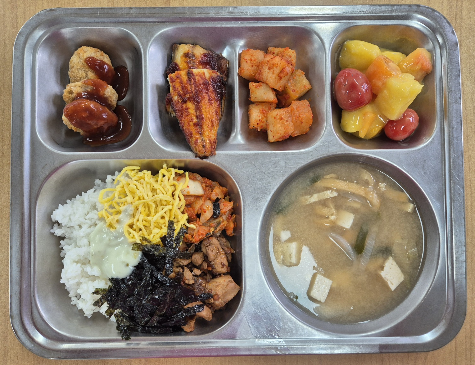[중식] 깐부치밥, 유부장국, 한입쏙까스, 매콤고갈비구이, 열대과일샐러드, 깍두기