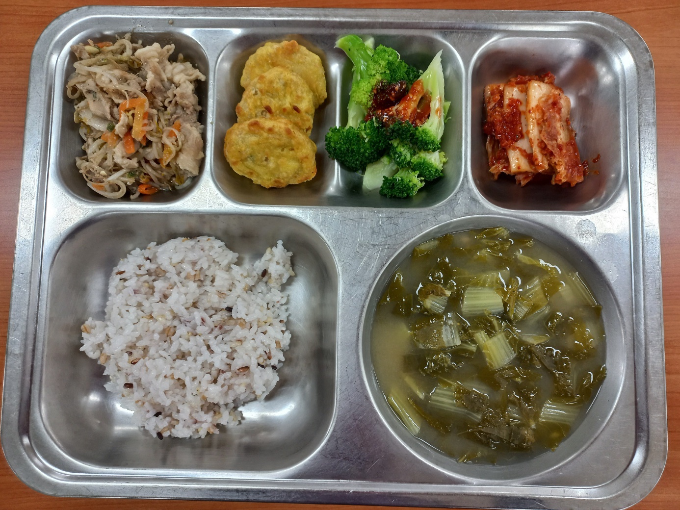 [조식] 친환경잡곡밥, 시락국, 대패삼겹숙주볶음, 동그랑땡전, 브로콜리&초장(자율), 배추김치