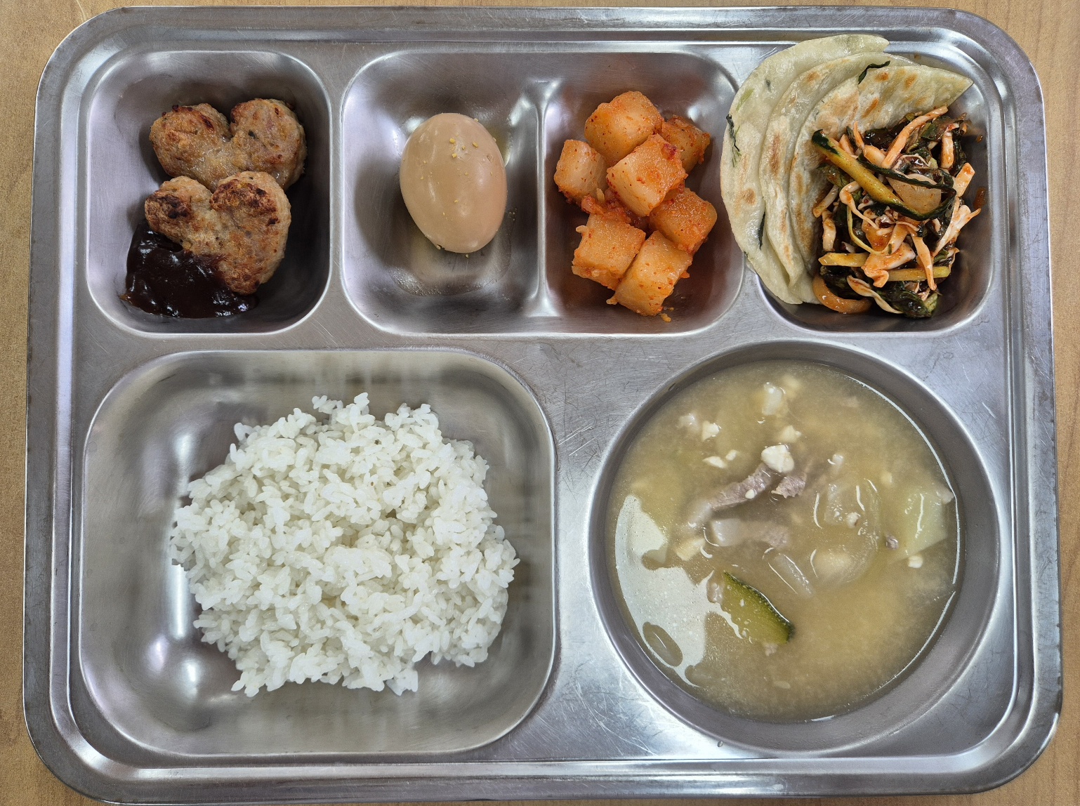 [석식] 친환경찹쌀밥, 연두부된장국, 하트미니함박, 납작만두*야채, 달걀장조림, 깍두기