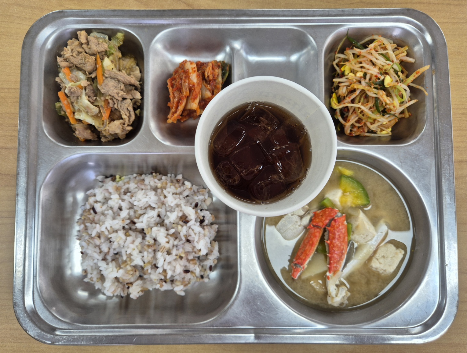 [중식] 친환경잡곡밥, 꽃게두부된장국, 간장불고기, 콩나물파채무침, 배추김치, 복숭아아이스티